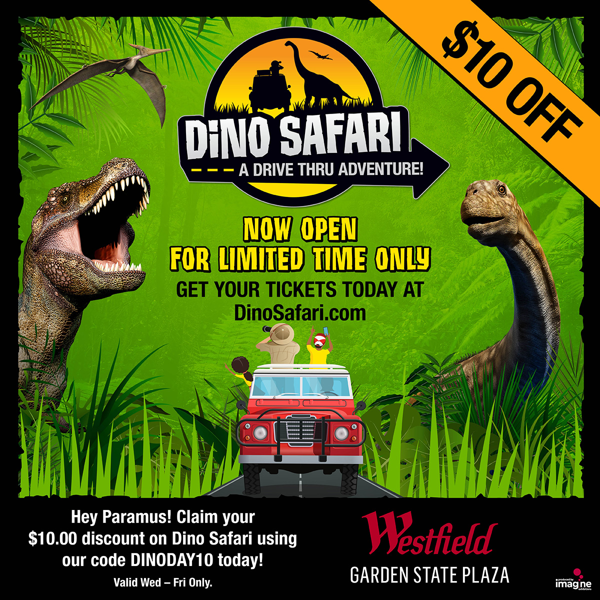 Park Entrance Fee 500 for NJ Residents. Dino Safari Open Until August 8. Westfield Garden State Plaza.